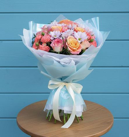 Очаровательный, милый и игривый букет, который по достоинству оценит молодая девушка. С ним вы сможете передать всю полноту ваших чувств и эмоции к ней, а так же признаться в любви или же извиниться. Благодаря обилию зелени в составе композиция кажется немного раскиданной, разноуровневой, будто вы собрали ее своими руками. Ну и, конечно, основное место занимают розы.